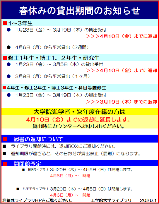 春休みの貸出期間のお知らせ 投稿日時 : 01/16 図書館管理者 利用者各位 いつも工学院ライブラリをご利用いただきありがとうございます。春休みの貸出期間についてお知らせします。 通常より長く借りることが出来ますので、ぜひご利用ください。詳細は以下の画像をご参照ください。